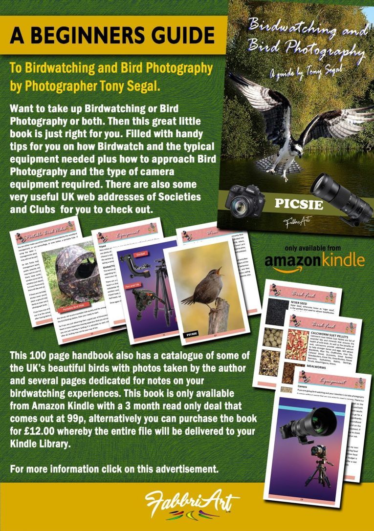 A great little book that will give you handy tips on how to approach this wonderful hobby, how to Birdwatch and the typical equipment needed for Bird Photography and the type of camera equipment required. There are also some very useful UK web addresses of Societies and clubs that you can click on to get direct to the web page.